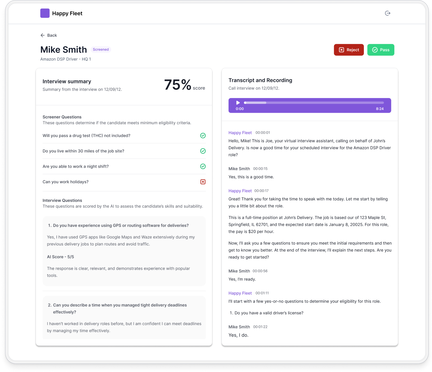 See AI-driven scores, strengths, and risks with summaries, transcripts, and playback. Move candidates forward or reject with one click.